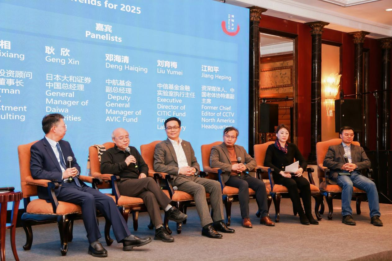 第一場圓桌討論主題為“2025年宏觀經濟形勢展望”,北京絲綢之路合作與發展促進會會長、人大重陽金融研究院高級研究員董少鵬主持,天相投資顧問公司董事長林義相、日本大和證券(中國)總經理耿欣、中航基金副總經理鄧海清、中信基金金融實驗室執行主任劉育梅、中央電視台北美總部前總編輯江和平參與討論。