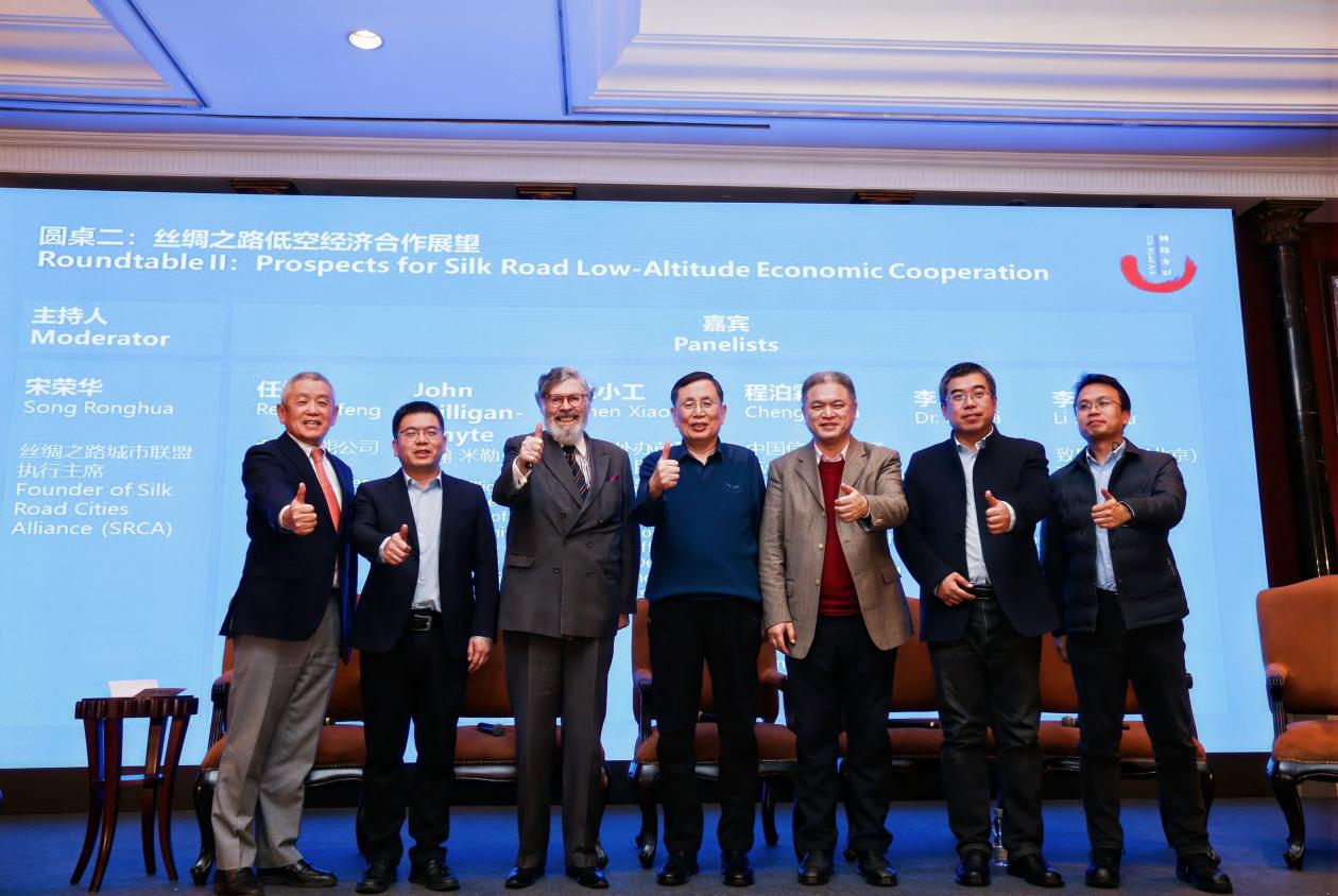第二場圓桌討論主題為“絲綢之路低空經濟合作展望”,絲綢之路城市聯盟執行主席宋榮華主持,中央外辦前副主任、空軍前副司令員陳小工,中國信息協會通航分會副會長、中國航空運輸協會無人機工作委員會副主任程泊霖、蜂巢航宇(北京)航空有限公司董事長李威、致導科技(北京)有限公司CEO李曉宇、卓翼智能公司CEO任雪峯參與討論。