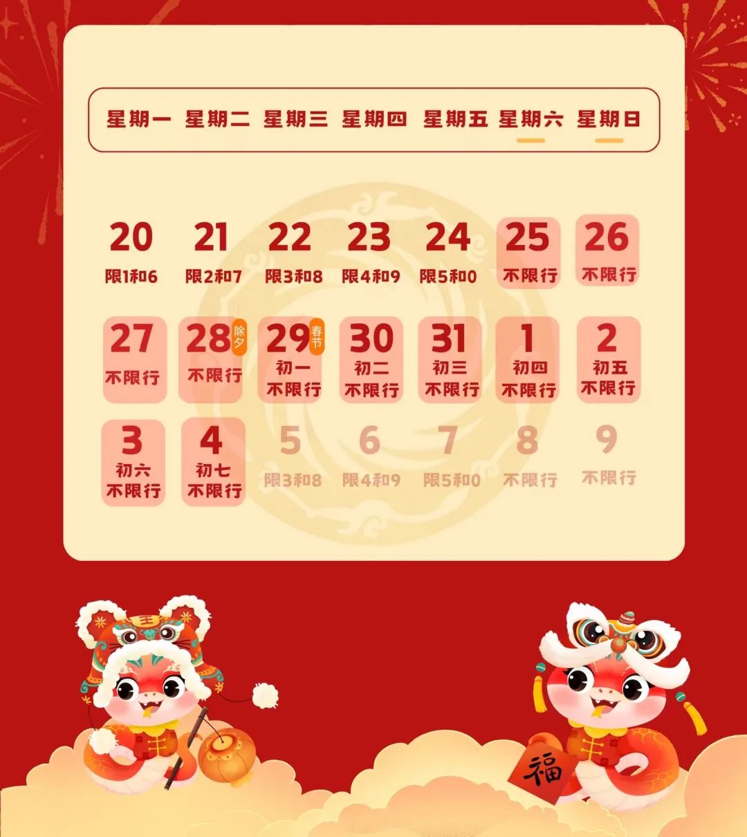 為方便市民出行與返鄉,讓除夕回家不再是一場與時間的賽跑,2025年1月27日,成都市取消機動車尾號限行,與春節放假調休相連,1月25日至2月4日,連續11天不限行,方便羣眾從容安排、安心享受春節假日旅程。