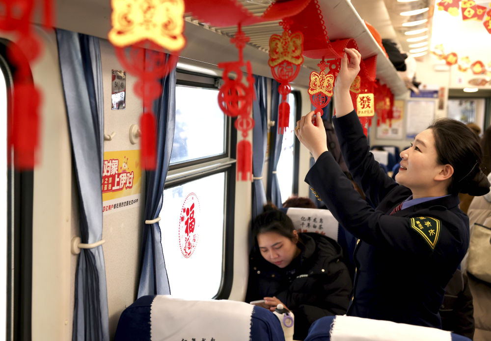 1月14日,列車工作人員在裝飾車廂。新華社發(王旺旺攝)
