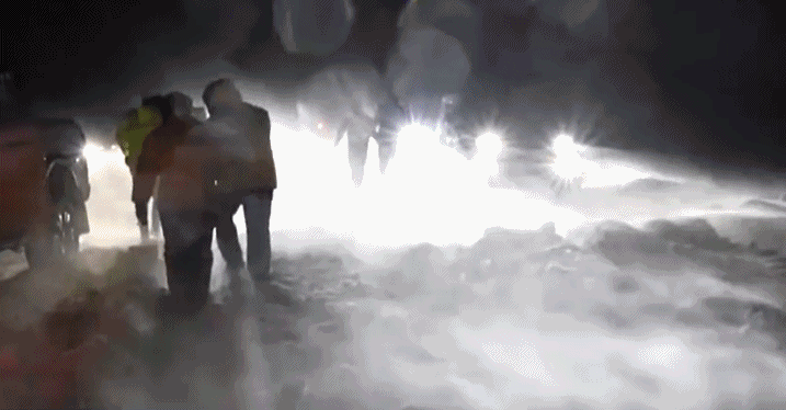 *新疆塔城地區托里縣交警大隊大隊長 李斌:*目前咱們318線風太大,現在所有的車輛全部都進不去。前面有幾輛闖進去的車剛都陷下去了,現在我們正在實施救援,請大家多多理解。