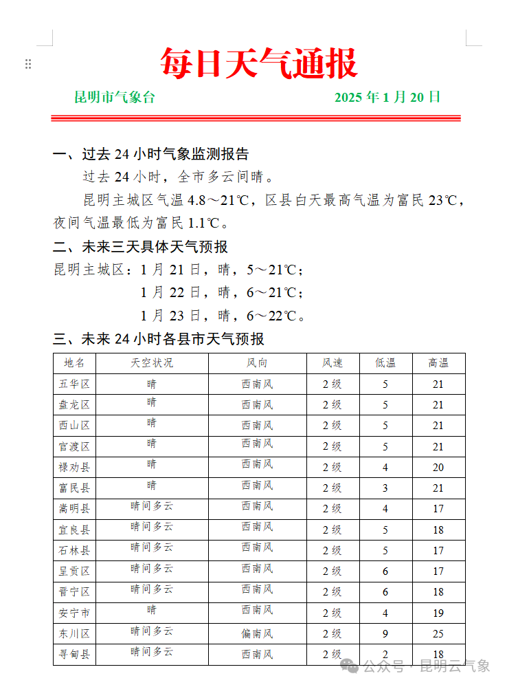 昭通市、曲靖市、文山州、紅河州南部多雲間陰局部有小雨,其他地區晴間多雲。