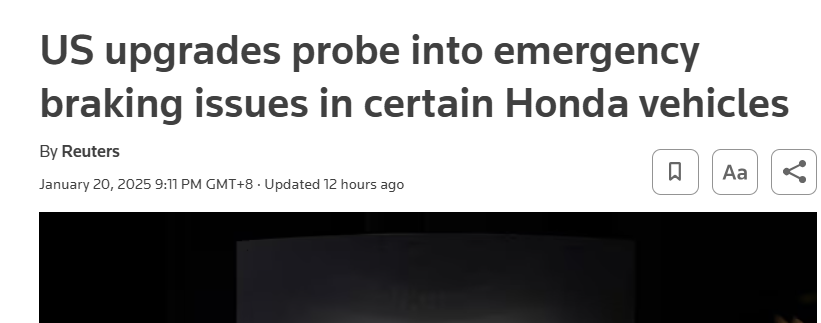 外媒:美國升級對部分本田汽車緊急制動問題的調查