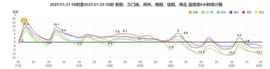 1月21日8時-29日8時河南省代表站逐6小時氣温預報