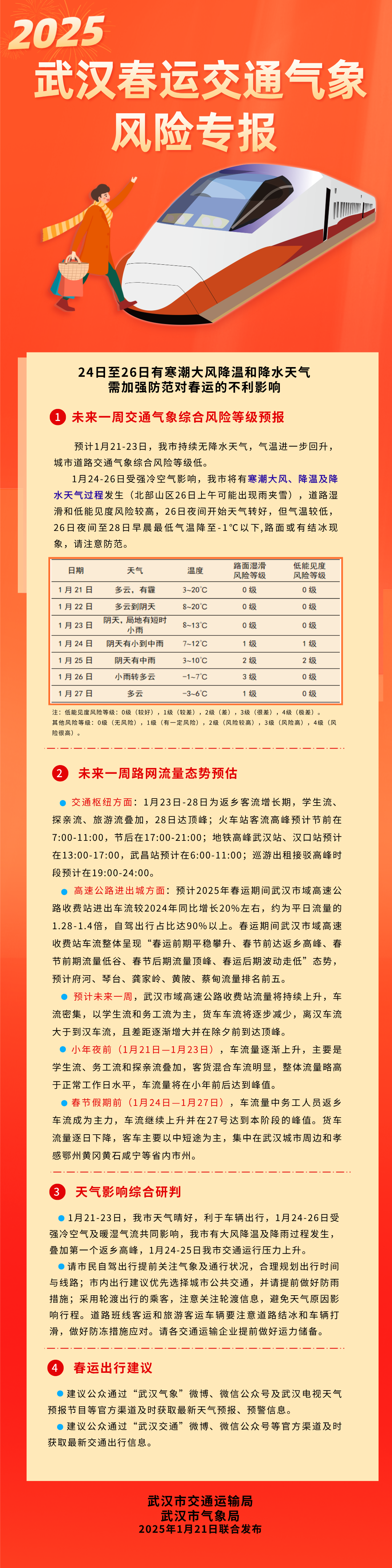 據中央氣象台預報,1月23日至27日,受寒潮影響,我國將有大範圍雨雪和大風降温天氣。本次雨雪過程的總體強度、持續時間不及2024年春節前後的兩次低温雨雪冰凍過程,也無大範圍凍雨,但正處於春節返鄉高峯期,將對春運交通帶來較大影響,建議公眾密切關注天氣預報,提前合理安排行程,並加強健康防護。