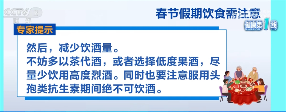 專家提示:首先,建議每餐以七八分飽為宜。 其次,講究“合理膳食”。減少大魚大肉的食用量,避免油炸、煎炒,降低油、鹽、糖的攝入。合理搭配主食、肉類、蔬菜和水果。然後,減少飲酒量。不妨多以茶代酒,或者選擇低度果酒,儘量少飲用高度烈酒。同時也要注意服用頭孢類抗生素期間絕不可飲酒。最後,保持規律的進餐時間。如果進餐時間被打亂,容易出現消化不良、胃脹、胃痛等問題。