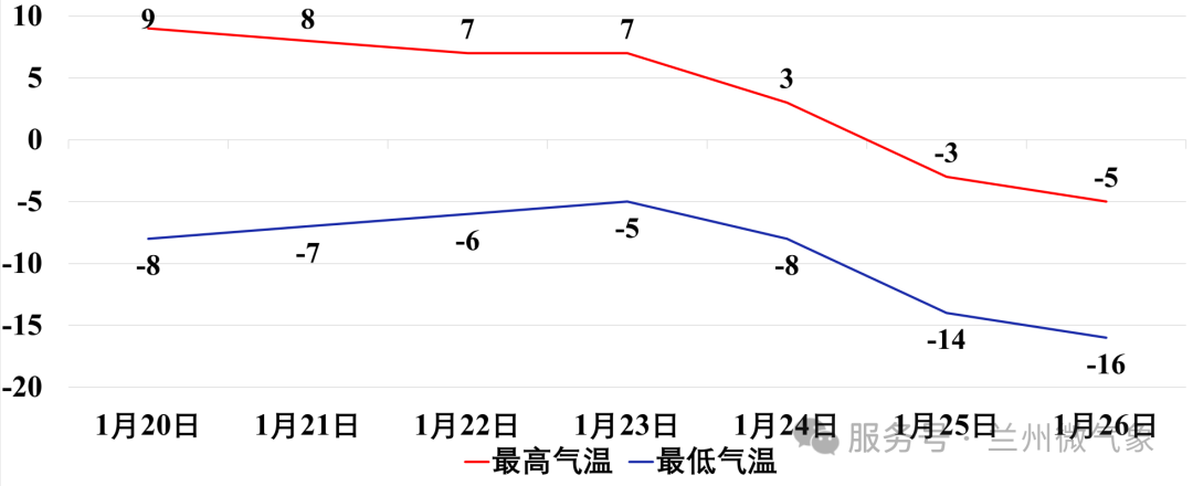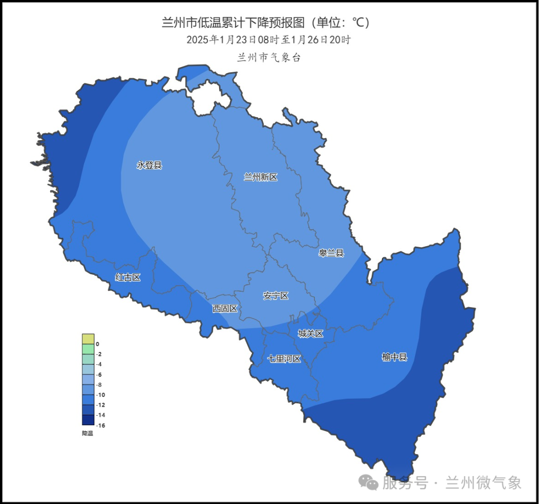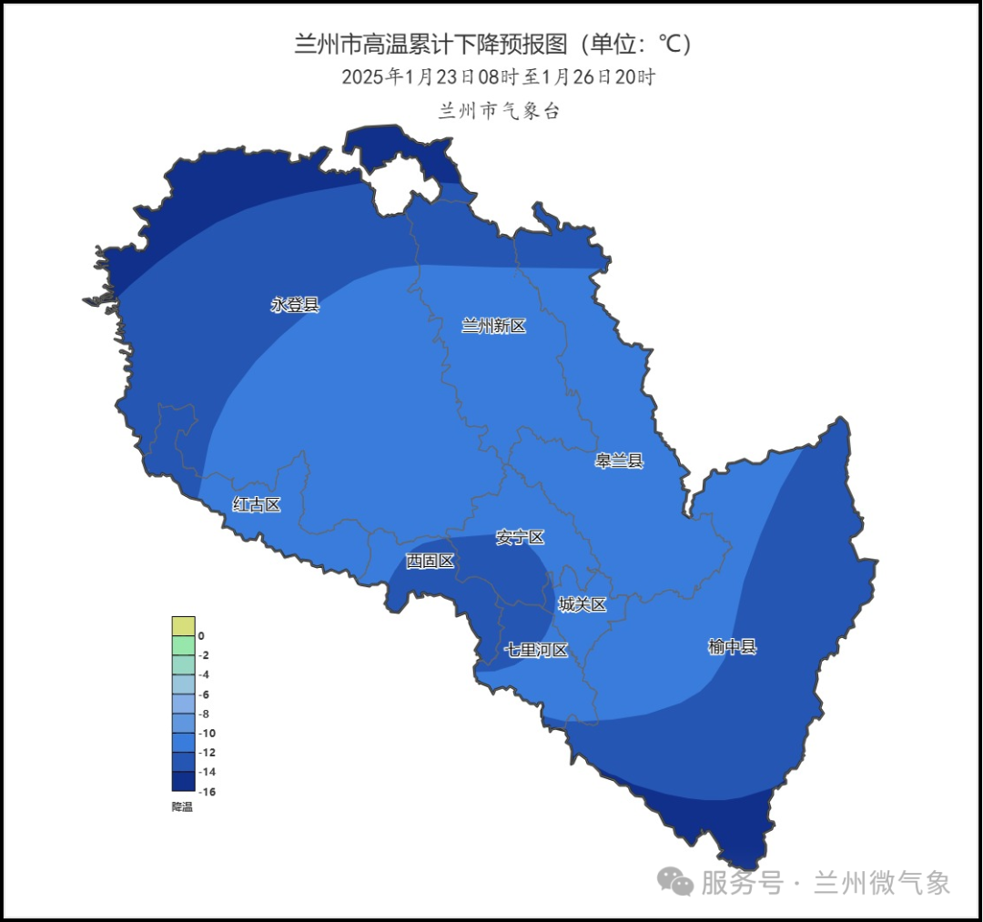預計24至26日,全市將出現寒潮,其中永登西北部及榆中東南部可達強寒潮。最高氣温累計下降11~15℃(圖2),最低氣温累計下降9~13℃(圖3)。26日市區最高氣温將降至-5℃,三縣及新區最高氣温-8~-5℃;最低氣温將出現在26日清晨,市區-16℃,三縣及新區-24~-17℃(圖4)。