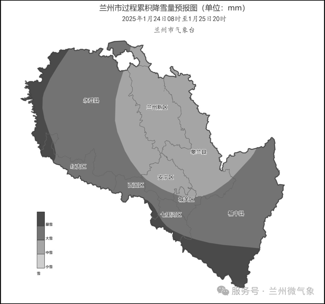 *降雪:*預計1月24日清晨至25日,全市有中雪(降雪量2.5~5.0毫米、最大積雪深度5釐米),七里河南部、西固南部、紅古西部、榆中中南部及永登西北部可達大到暴雪(降雪量5.0~10.0毫米、最大積雪深度12釐米)(圖1)。