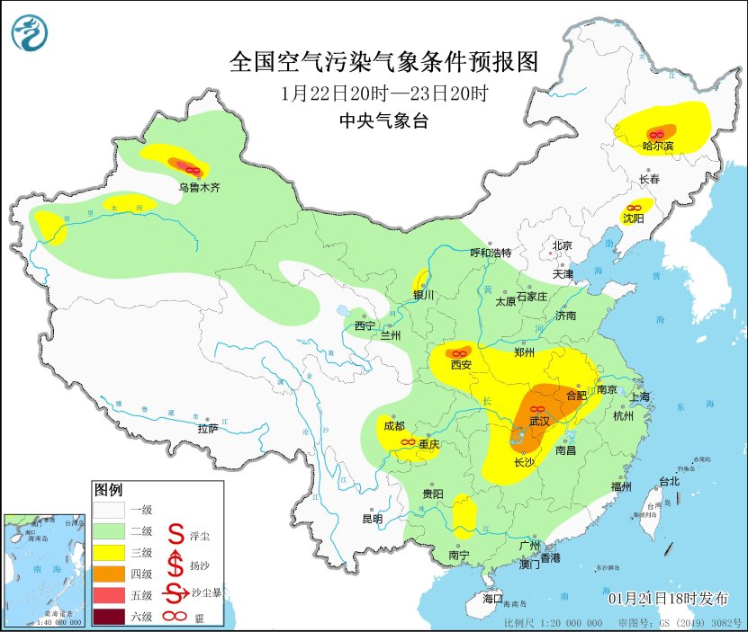 21日夜間至22日,華北南部、黃淮、江淮、江漢、汾渭平原等地有輕至中度霾,局地有重度霾。23日至24日,華北、黃淮等地霾天氣明顯減弱,但江漢、江南西部受輸送影響,仍有輕至中度霾。25日起,受降水和冷空氣影響,大部地區霾天氣消散。