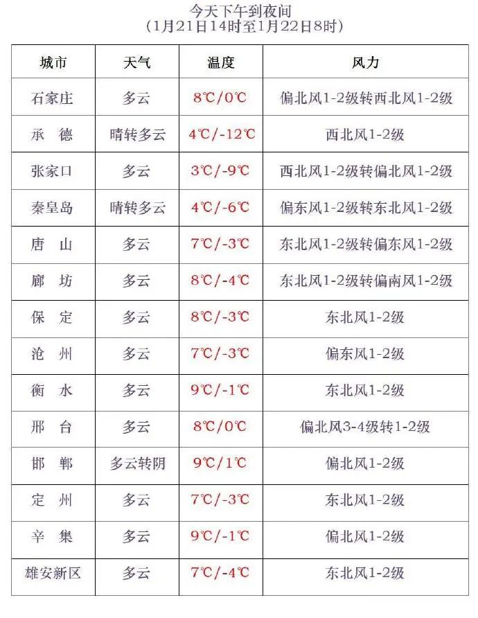 *今天下午到夜間,*邢台南部、邯鄲多雲間陰,其他地區晴間多雲。渤海海域和沿海地區有東到東北風4到5級,陣風6到7級。最高氣温,張家口、承德-12~5℃,其他地區6~10℃。最低氣温,張家口、承德、秦皇島北部、唐山北部、保定西北部-23~-8℃,其他地區-7~1℃。