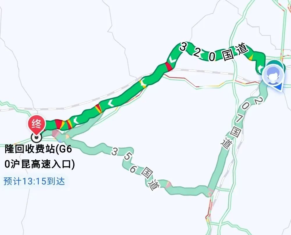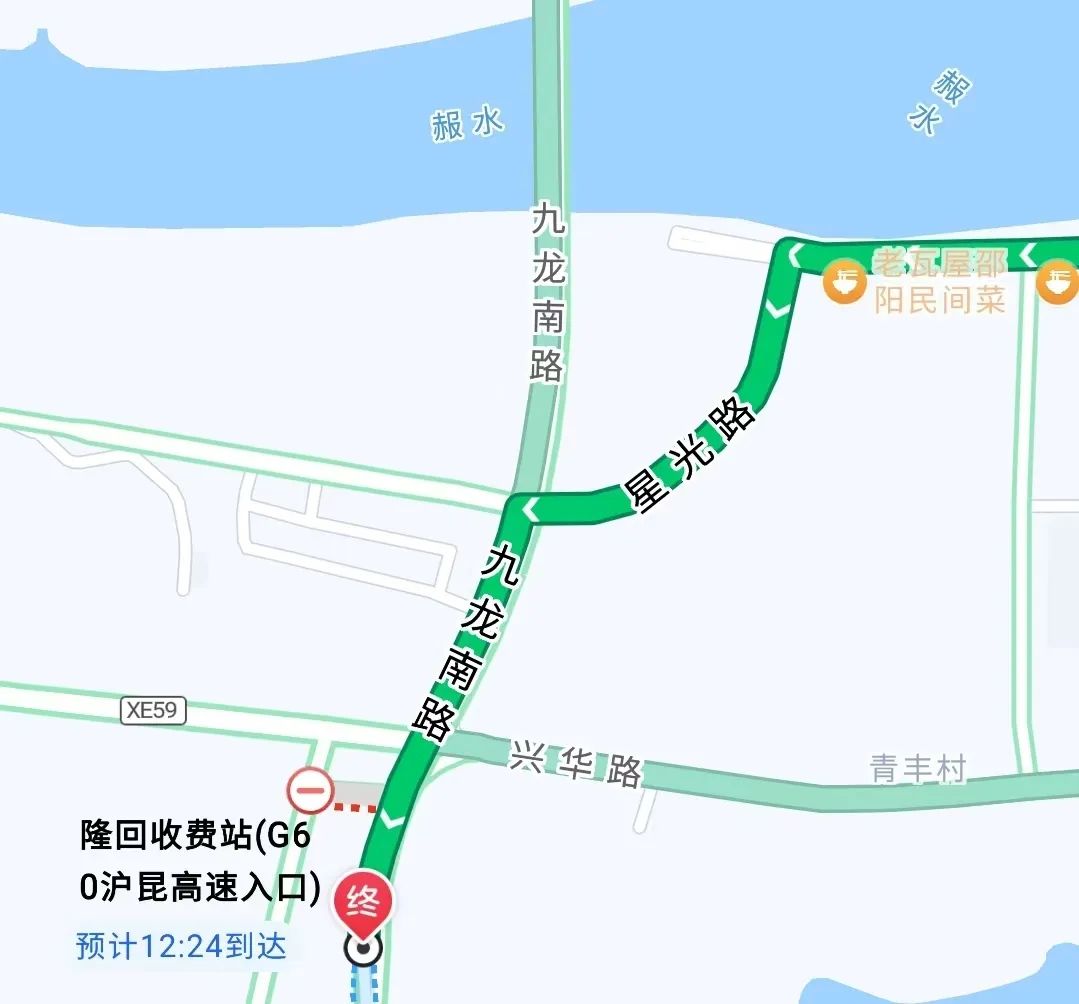 從赧水北路進入星光路,再從星光路拐至九龍南路直行到達滬昆高速隆回收費站,全程6.3km,用時13分鐘,沿途路況良好。
