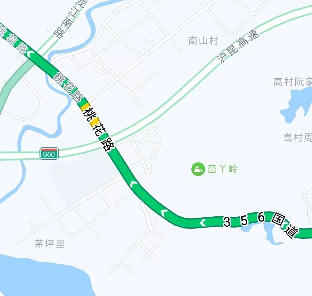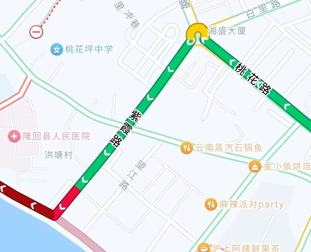 從356國道一路向西北方向行至隆回縣桃花路,全程43km,用時50分鐘,車流較大,通行順暢。其中,天子湖不夜城景區、隆回縣北山鎮違停、佔道經營現象較多,需注意安全駕駛。