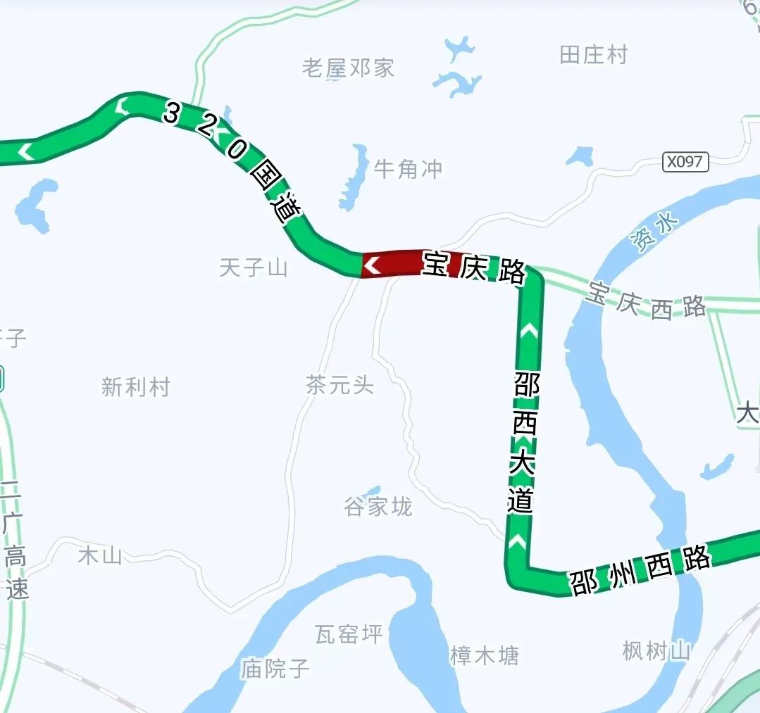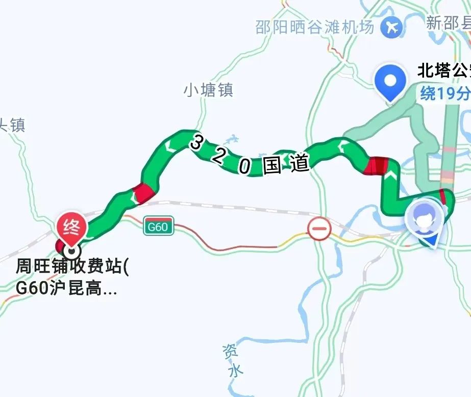 從邵州路一路行至邵西大道,從邵西大道左轉,進入320國道,全程7公里,用時25分鐘。途經邵陽城區,車流較多,通行正常。