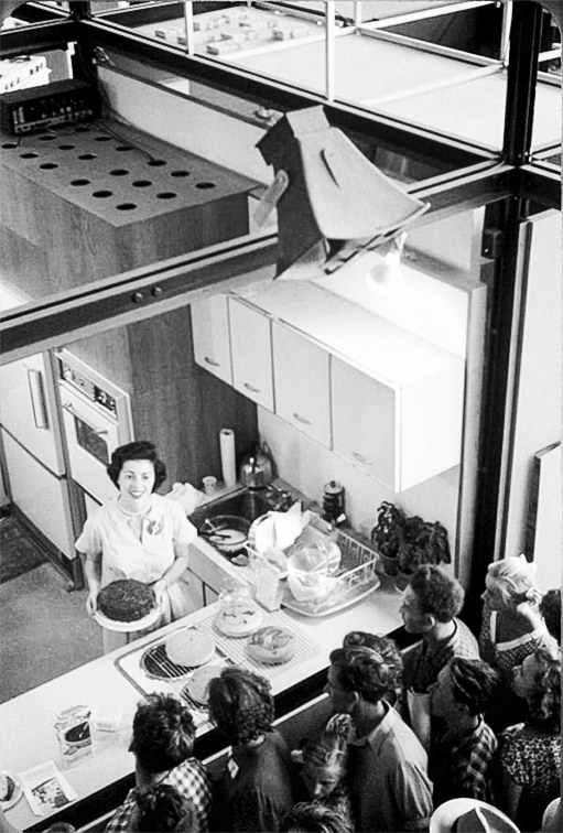 在紐約的“蘇聯國家展”開館後一個月,1959年7月,“美國國家展”在莫斯科的索科利尼基公園亮相。相對於蘇聯展覽的“硬核工業風”,美國展更像一場大型進出口貿易展,偏重展示該國居民的日常生活,展品包括家用電器、時尚單品、體育用品、兒童玩具,還有汽車,甚至樣板間。美方特意打造了一個科技感十足的參觀環境,並展出不少前沿科技,如雙手可以活動的遙控機器人、彩色電視等。