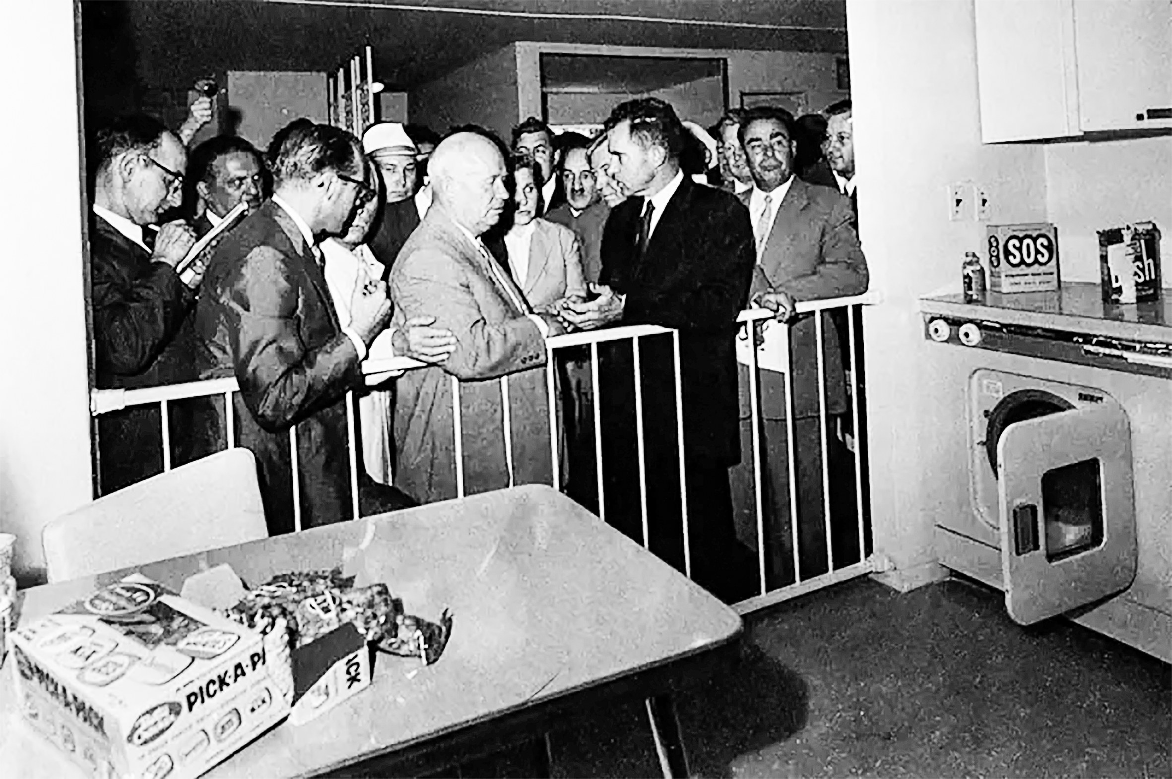 出於對“文化交流”的重視,時任美國副總統尼克松親自前往莫斯科,為美國的國家展揭幕,還在展會期間與蘇聯領導人赫魯曉夫會晤。這場展會不涉政治,但兩國領導人都心照不宣,明白展廳即“戰場”,都暗暗憋着一股勁,誰也不想在言語上吃虧。二人最為激烈的“交鋒”發生在展廳一處廚房樣板間,該場面也由此得名“廚房辯論”。