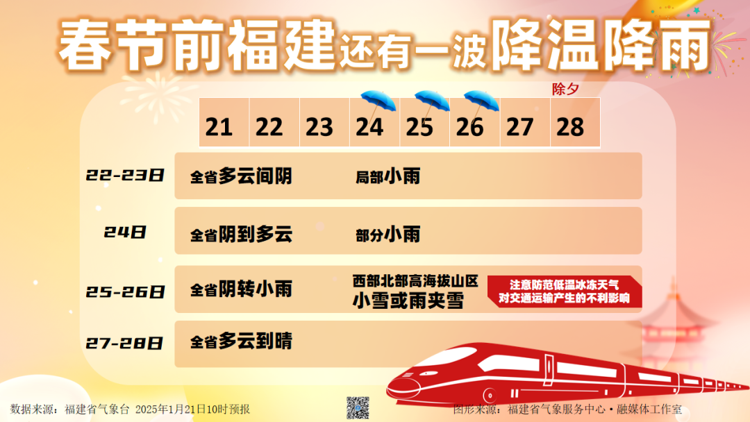 關注26—29日寒潮天氣對人體健康和農業生產的影響,重點關注26日我省西北部高海拔山區雨雪天氣和道路結冰對能源保供、供水保障和交通安全的不利影響。