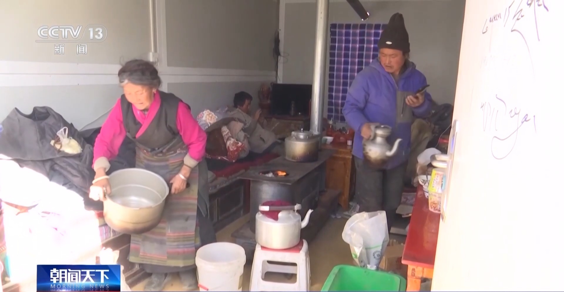 在森嘎村,記者看到板房內取暖設施一應俱全,家家户户都能在板房裏生火做飯,每天都有肉類和蔬菜發放。