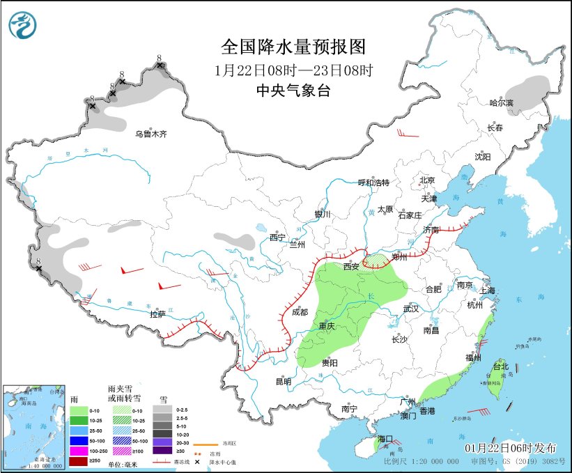 *1月22日08時至23日08時,*新疆西北部和南疆西部山區、西藏西南部、青海中部、黑龍江東南部等地部分地區有小到中雪,其中,新疆西北部、西藏西南部等地局地有大雪(5~8毫米)。陝西南部、四川東部、重慶、貴州北部、雲南東北部、湖北西部、河南南部及廣東南部沿海、福建東南部沿海、浙江東部沿海、台灣島等地部分地區有小雨。西藏大部、青海南部、川西高原等地部分地區有6~7級、陣風8~9級的大風(見圖1)。