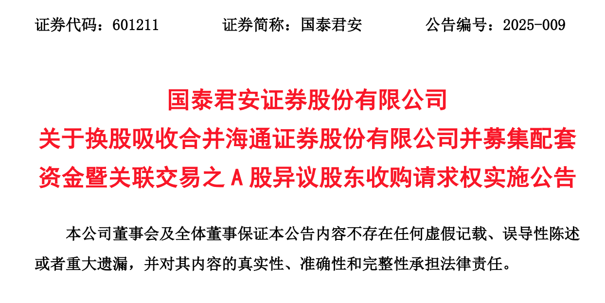 【環球網財經綜合報道】1月21日晚間,國泰君安與海通證券同步發佈公告,詳細披露了A股異議股東收購請求權及現金選擇權的實施安排。公告中明確了行權價格、申報時間及方式,並特別提醒股東,由於當前兩家公司A股價格大幅高於行權價格,行使相關權利可能導致虧損。