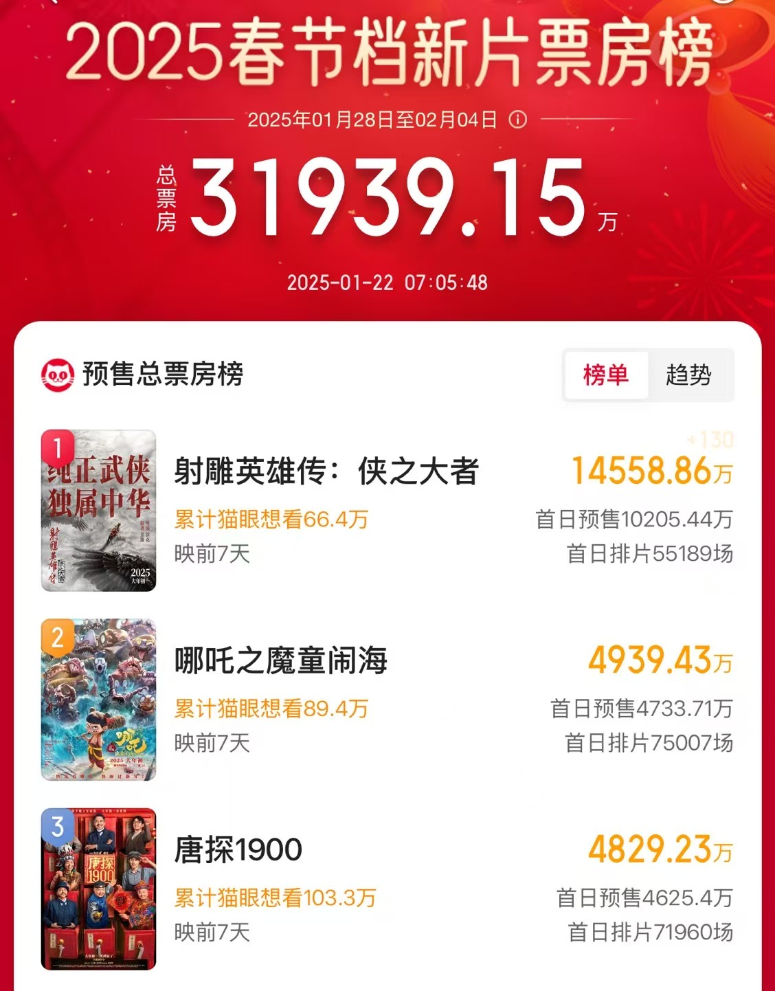 截至目前,多部大片已經宣佈定檔2025年春節檔,其中包括《射鵰英雄傳:俠之大者》《哪吒之魔童鬧海》《唐探1900》等備受期待的作品。這些影片的題材豐富多樣,涵蓋了動作、奇幻、喜劇等多種類型,滿足了不同觀眾的口味需求。