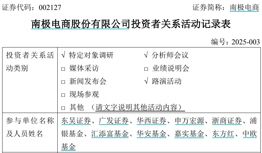 【環球網財經綜合報道】1月22日,上市公司南極電商(002127)發佈了《投資者關係活動記錄表》,披露公司接待了東吳證券、廣發證券、華西證券等多家機構調研,公司副總經理陳虹宇、董事會秘書朱星毓出席並解答投資機構代表提問。