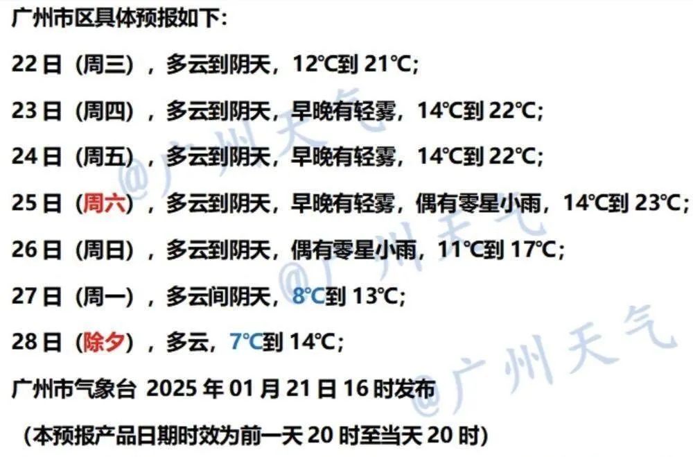 廣州市氣象台1月21日傍晚市區七天預報。圖/@廣州天氣