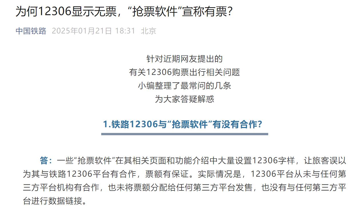 國鐵集團表示,部分“搶票軟件”通過頁面設計和功能介紹誤導旅客,使其誤以為與12306平台有合作關係,但實際上12306從未將票額分配給任何第三方平台,也未與其進行數據鏈接。