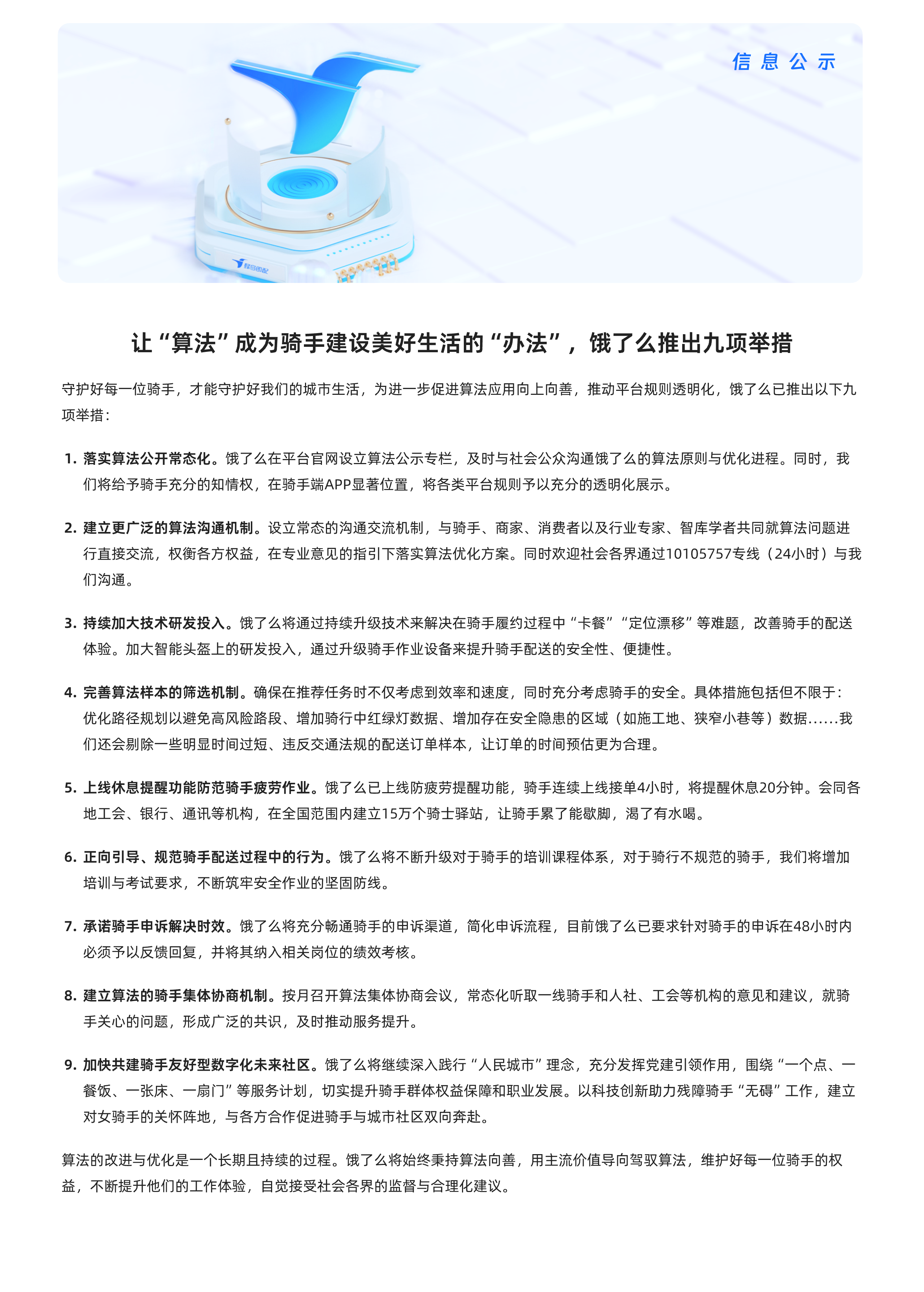 餓了麼的舉措中包括落實算法公開常態化、建立更廣泛的算法溝通機制、持續加大技術研發投入、完善算法樣本的篩選機制、上線休息提醒功能防範騎手疲勞作業、正向引導及規範騎手配送過程中的行為、承諾騎手申訴解決時效、建立算法的騎手集體協商機制、加快共建騎手友好型數字化未來社區等。同時,餓了麼已在官方網站設立了算法的公示頁。