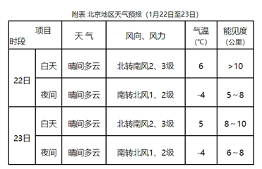 預計,22日至23日北京地區天氣為晴間多雲。期間大氣擴散條件及能見度轉差,夜間有輕霧;白天最高氣温6~5℃,夜間最低氣温-4℃左右(見附表)。