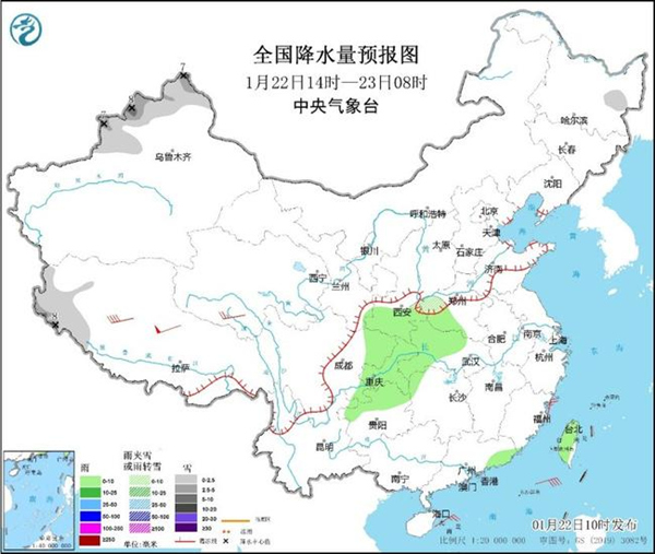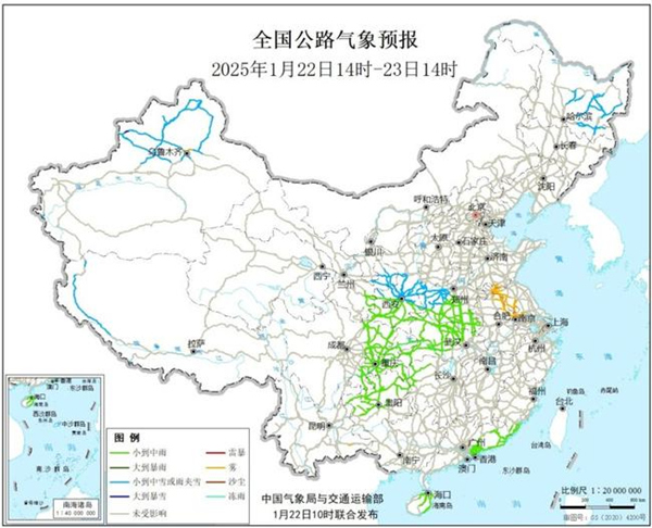 今天,全國大部地區降水稀少,新疆和西藏關注降雪可能造成的道路濕滑和積雪、結冰;江蘇、安徽、新疆關注局地大霧影響交通安全。23日起寒潮將影響我國大部,關注大範圍雨雪天氣對交通出行的不利影響。