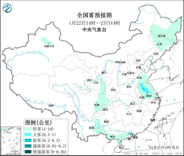 1月22日夜間至23日早晨時段,江蘇西部、安徽東北部、新疆天山北坡等地的部分地區有大霧天氣,局地有能見度低於200米的強濃霧(見圖1)。