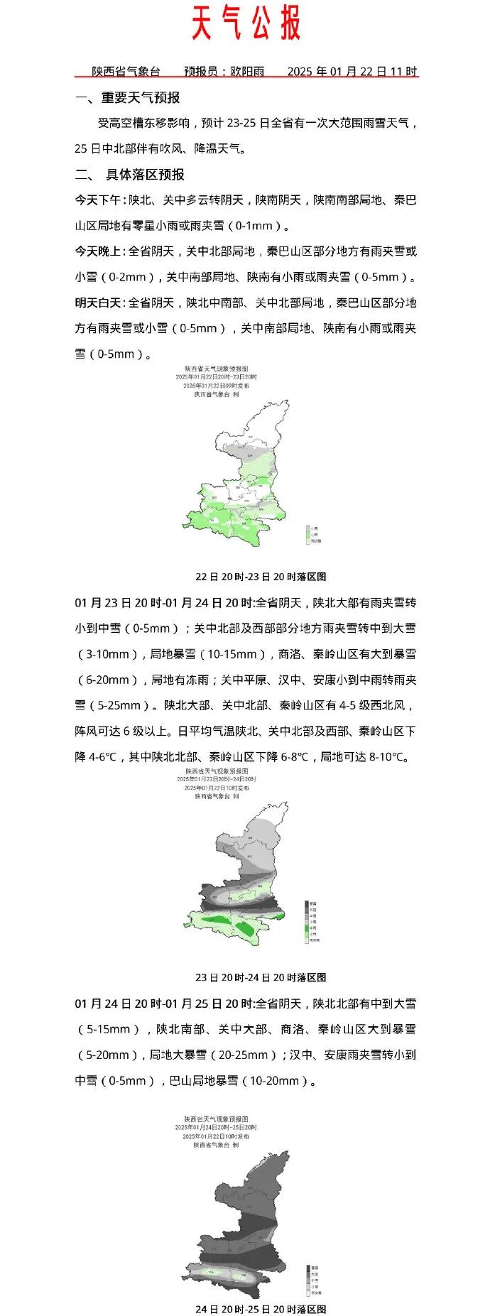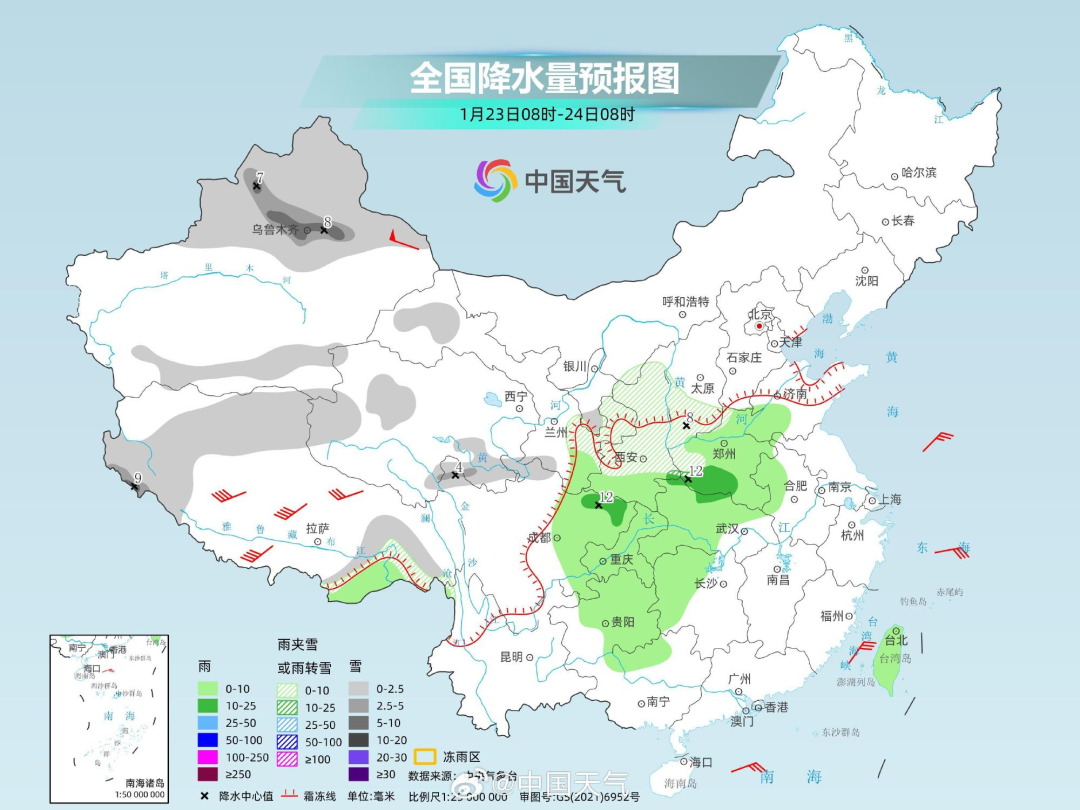 *這也意味着本次雨雪天氣過程,將有望為西安城區帶來去年入冬以來的首場降雪。*預計1月23日夜間平原地區有分散性小雨、南部山區有分散性雨夾雪(0~1毫米);1月24日城區及平原地區小雨轉雨夾雪轉小到中雪,南部山區有中到大雪,局地大到暴雪(3~12毫米);25日城區及平原地區陰天轉小到中雪,南部山區中到大雪(3~5毫米)。