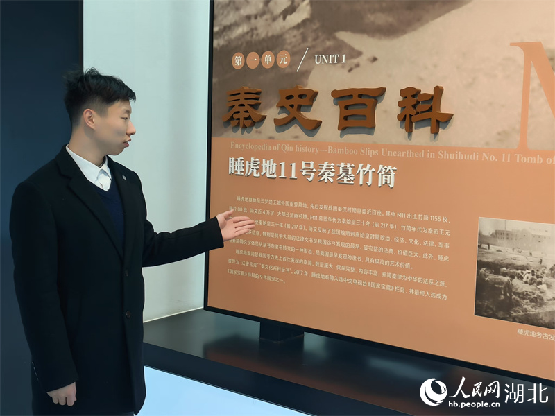 對於大多數遊客來説,僅僅看竹簡上的文字,可能看不懂。近年來,雲夢縣博物館運用展櫃後面的電子屏,讓“複雜”的秦簡簡單化。同時還增加了AR、文物互動屏等科技元素,引入數字人“喜”,給遊客科普簡牘故事,增加遊客互動體驗感。