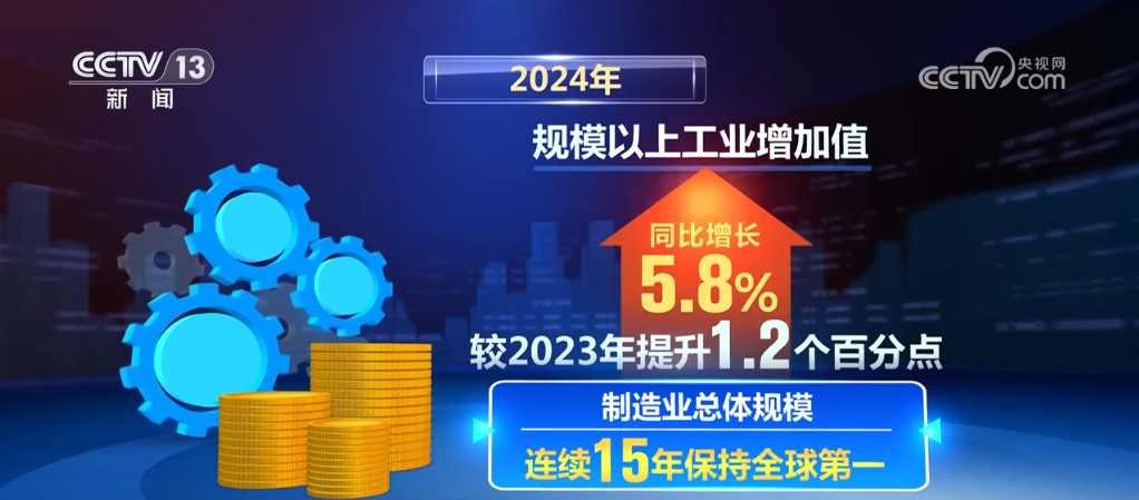 數據顯示,2024年,規模以上工業增加值同比增長5.8%,較2023年提升1.2個百分點,製造業總體規模連續15年保持全球第一,工業和信息化領域對經濟增長的貢獻為四成,有效發揮了“穩定器”“壓艙石”的作用。