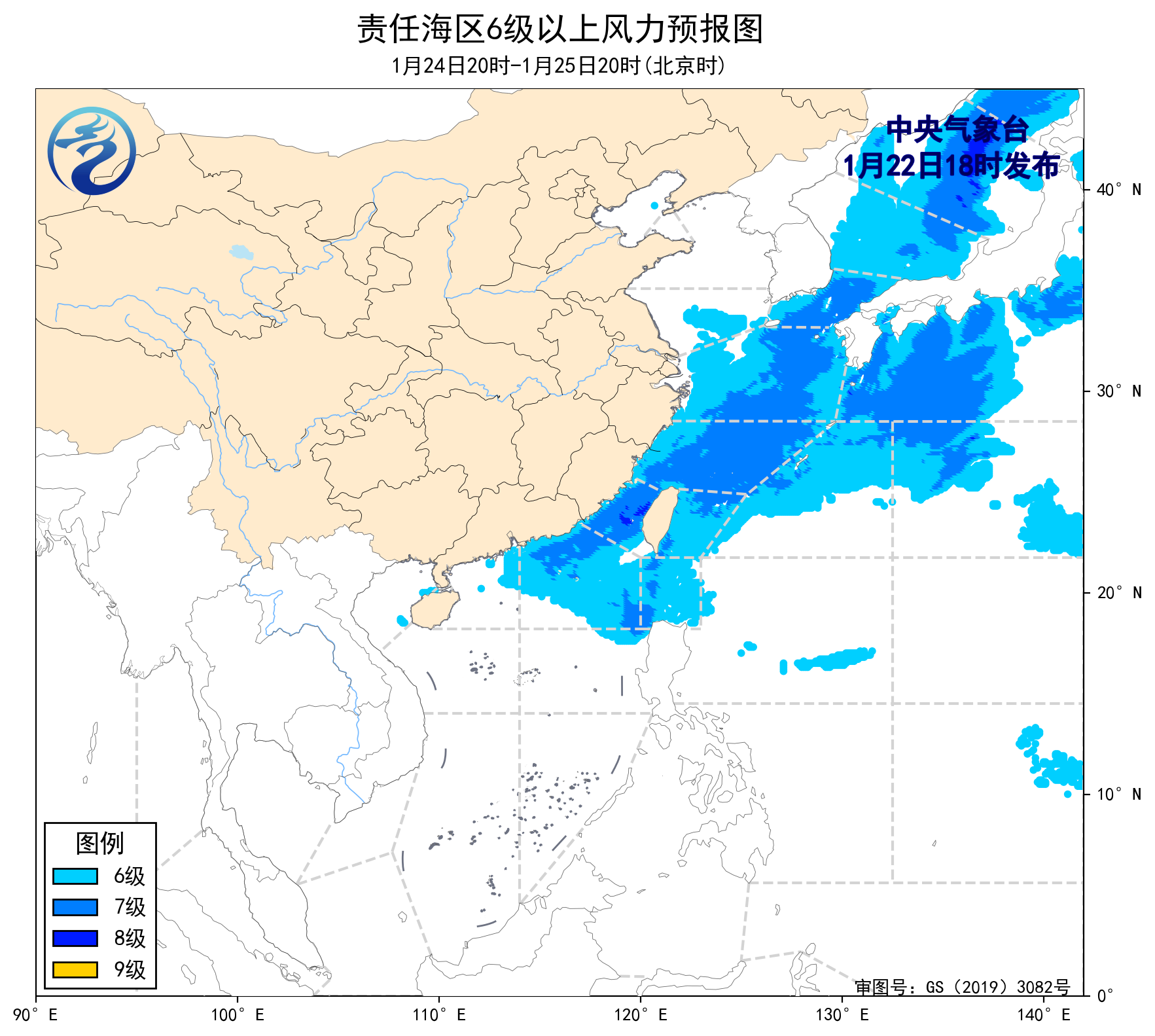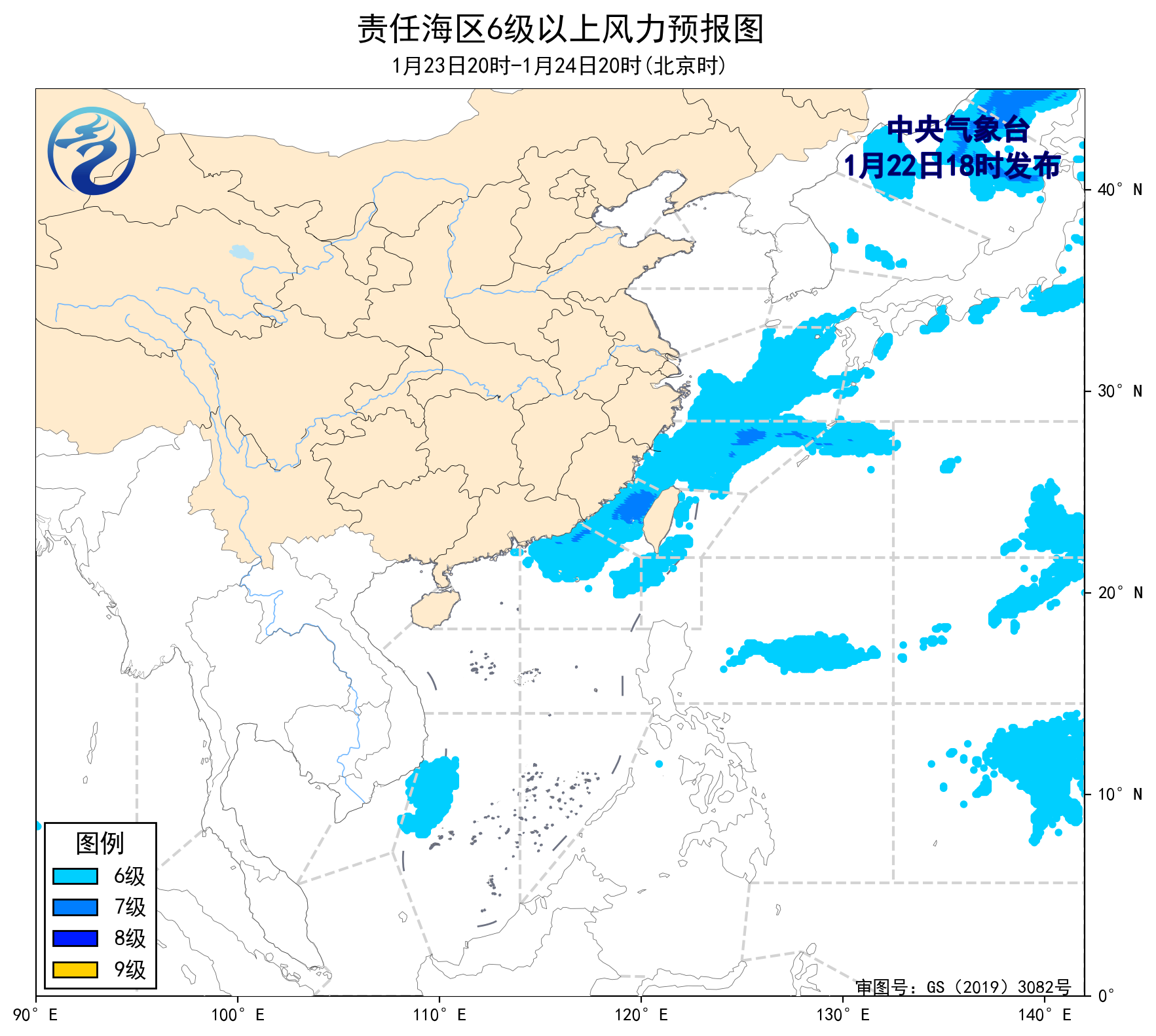 1月22日02時至14時,東海南部海域、台灣海峽、台灣以東洋麪、巴士海峽、南海大部海域出現了5~6級、陣風7級的偏北風。瓊州海峽出現輕霧,能見度不足10公里。