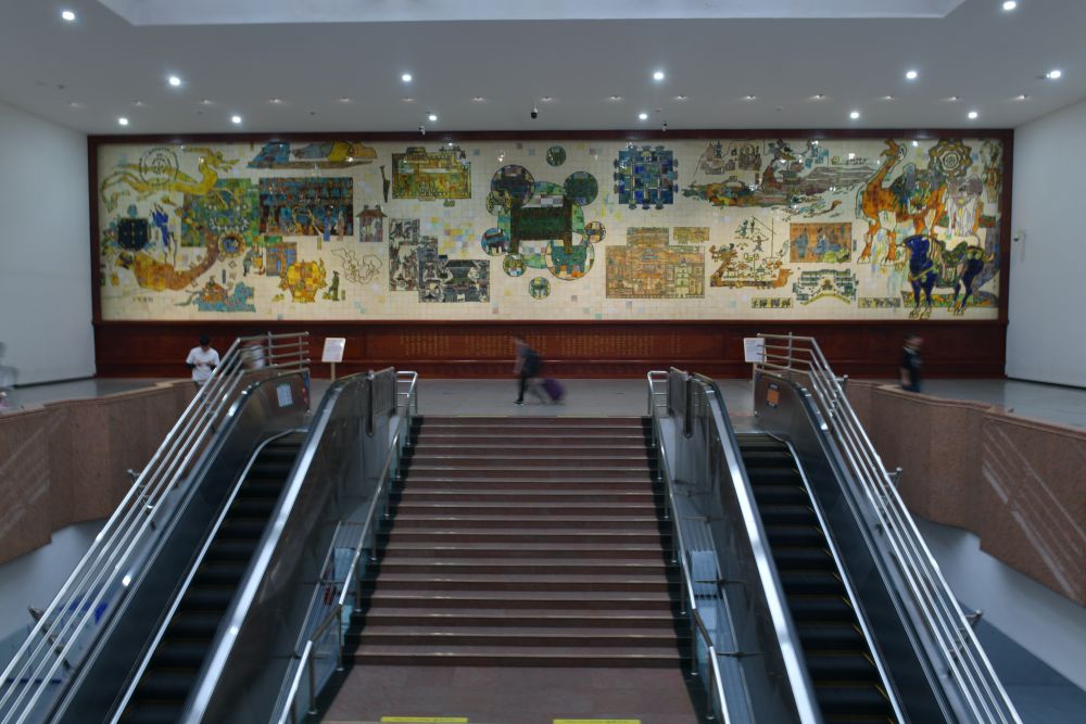 走進具有百年文化積澱的洛陽火車站,《天中春秋》巨幅唐三彩壁畫映入眼簾,從唐三彩雙峯駱駝俑、黑釉三彩馬,到洛神飛天、龍舟雜技、唐詩三傑……一幅畫讀懂河洛“春秋”故事。