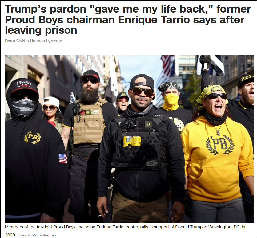 22日,參與“國會山騷亂”事件的極右翼組織“驕傲男孩”前首領恩裏克·塔里奧被特朗普特赦出獄。在接受採訪時,恩裏克公開呼籲應“報復”參與調查此案的人。