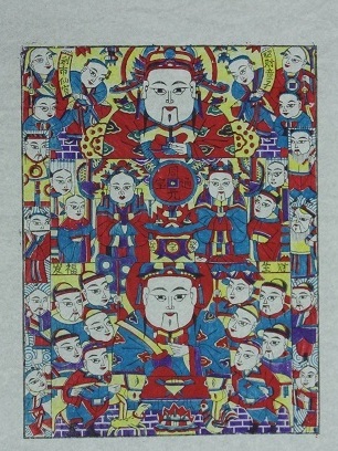 △ 山東楊家埠年畫《灶王》,上為增福財神,中為灶王與灶王奶奶坐於灶王府中,下為灶王坐堂,辦理公事。中國農業博物館藏