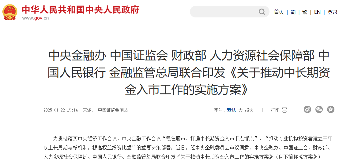 【環球網財經綜合報道】為實現資本市場的長期穩定發展,中央金融辦、中國證監會、財政部、人力資源社會保障部、中國人民銀行、金融監管總局1月22日聯合印發了《關於推動中長期資金入市工作的實施方案》(簡稱《方案》)。此舉是為貫徹落實中央經濟工作會議、中央金融工作會議的重要決策部署,穩定股市、暢通中長期資金入市渠道。