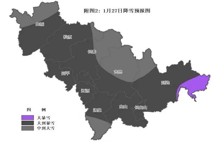27日白天到夜間,白城大部、松原、長春南部、四平、遼源、吉林南部、通化北部、白山、延邊大部、長白山保護開發區有大到暴雪,其中延邊東部部分地方有大暴雪,其他地區有中到大雪。