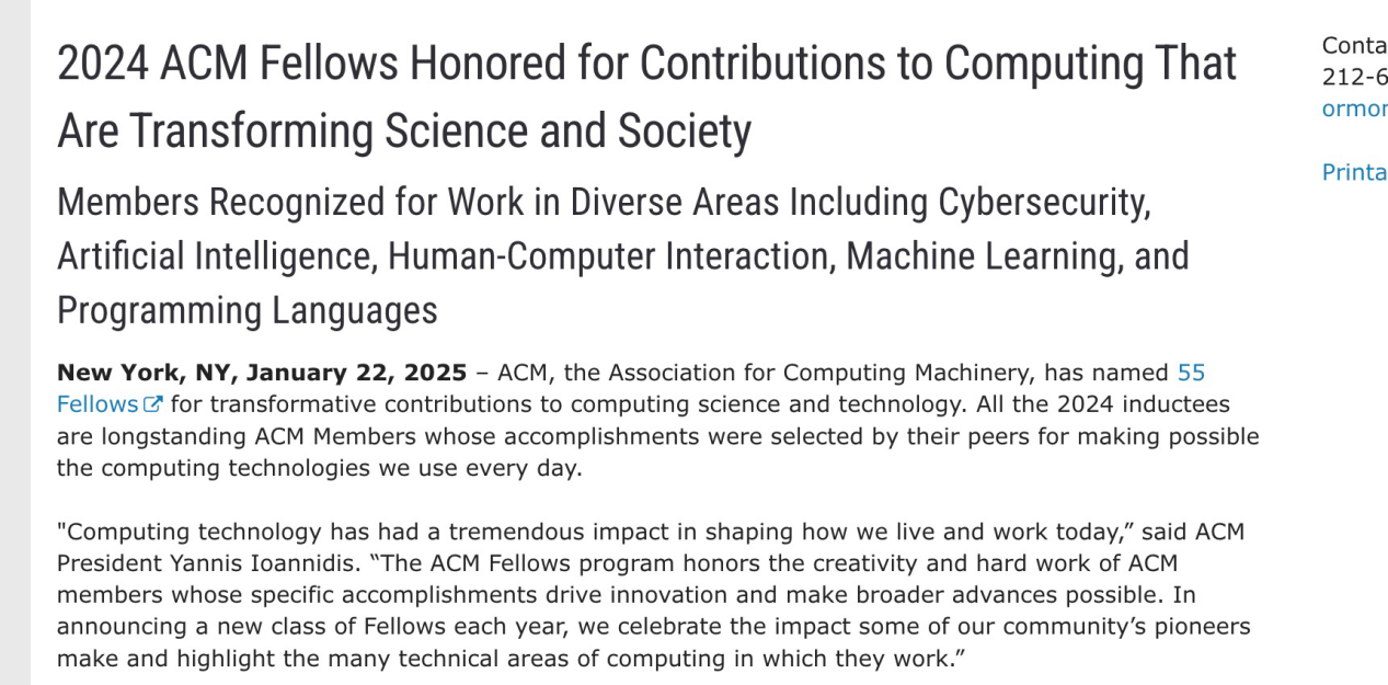據介紹,ACM 創立於 1947 年,是全世界計算機領域影響力最大的專業學術組織之一,ACM Fellow是會員中對計算機相關領域貢獻前 1% 的學者。(勃潺)