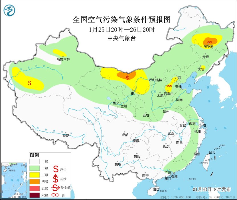 23日夜間,區域大氣擴散條件一般,陝西關中、山西南部等地的部分地區有輕至中度霾。24日起,受降水和冷空氣共同影響,區域大氣擴散和濕清除條件較好,無明顯霾天氣。