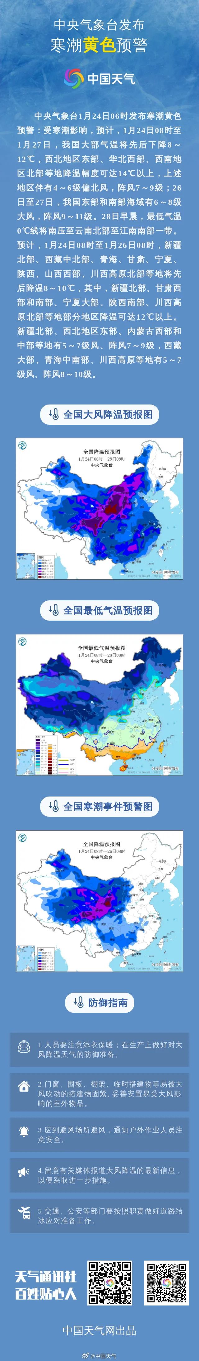 5.加固棚架等易被雪壓的臨時搭建物。寒潮黃色預警!降温圖都“凍紫了”**