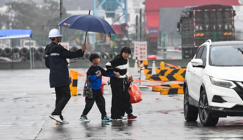 1月14日,在海南省海口市秀英港,工作人員為準備乘船的旅客打傘。新華社記者 楊冠宇 攝