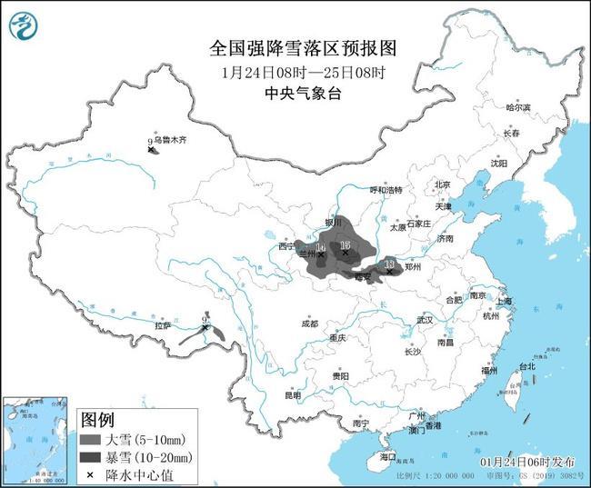 預計1月24日08時至1月25日8時,西藏東南部、青海東北部、甘肅中東部和南部、寧夏、陝西中部和南部、河南西部等地部分地區有大雪,其中,甘肅南部、寧夏南部、陝西中南部、河南西部等地部分地區有暴雪(10~18毫米)。上述部分地區新增積雪深度2~5釐米,局地可達10釐米以上。