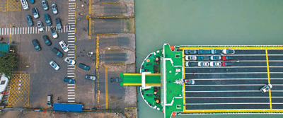 海南海口市秀英港,車輛排隊駛入新能源車專用運輸船“綠源二號”。
