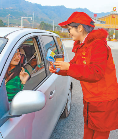 呼北高速廣西梧州蒙山西高速出入口服務點,志願者為旅客送上春節禮物。