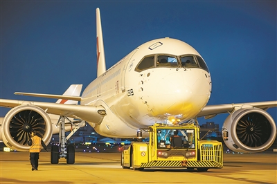 東航技術國產飛機維修部工作人員指揮牽引車將C919大飛機牽引至機庫。