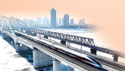 春運期間,復興號高寒智能動車組奔馳在哈齊高鐵松花江特大橋上。