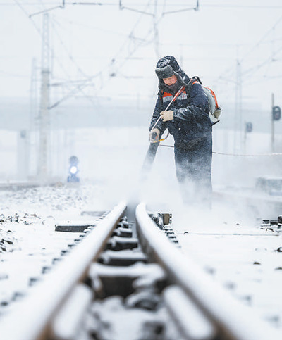 春運期間,國鐵瀋陽局阜新工務段職工進行道岔除雪作業,保障運輸安全。